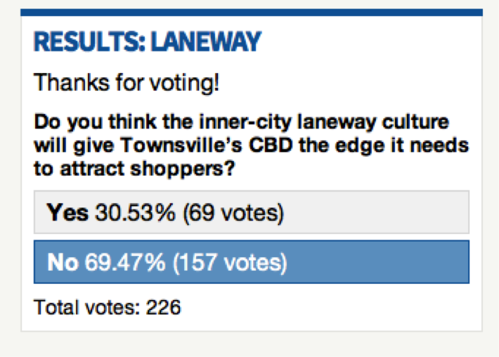 Some Townsville business people appear excited by the prospect of laneway developments in Townsville CBD, which has struggled for years to compete as a retail centre against the big suburban shopping centres at Aitkenvale and Willows (see CBD set to move into the espresso lane and Flinders St Traders welcome laneway precinct). Many Townsville residents are obviously skeptical, however, based on a poll on the Townsville Bulletin website: