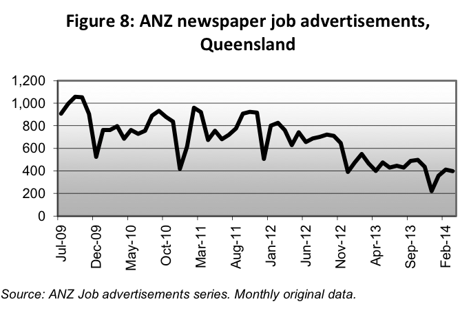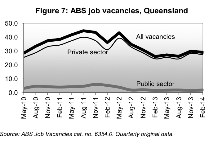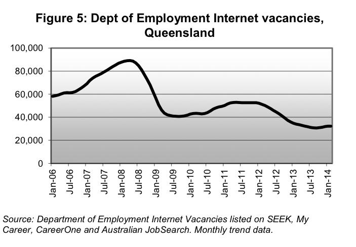 Tomorrow’s release of April labour force data from the ABS will hopefully confirm a recovery in the job market in Queensland, continuing the positive trend from last month (see my post from last month: Qld unemployment rate falls slightly to 6.1% – rising participation a good sign). But data on job vacancies presented in the Queensland Training Department’s latest quarterly Labour Market and Training Review suggest any recovery may be slow, given vacancies remain at low levels and aren’t surging back (see the charts I’ve copied from the Review and pasted below). Another reason not to get too excited about the labour market just yet is the Federal Employment Department’s leading indicator of employment, which has declined for the seventh consecutive month, as reported by MacroBusiness today (DEEWR leading jobs index falls again).