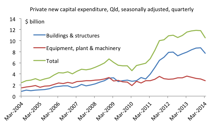 The March quarter private capital spending figures released today by the ABS confirm that Treasury was right to make conservative, sub-par growth forecasts in developing the Federal Budget. Queensland Treasury will have to do the same in the Queensland Budget, which is being released next Tuesday 4 June. The economy will clearly be impacted by declining private capital spending, which fell 11.1% in the State in the March quarter – compared with a fall of 4.2% nationally – largely related to declining mining sector investment (see chart below). The Queensland Budget delivered next Tuesday will have been developed in a challenging environment, and hence it’s even more important to rely on asset sales to pay down debt, rather than cutting spending or raising taxes, which would adversely impact an already sub-par economy. We will need to wait and see whether the recovery in non-mining building activity reported yesterday will be sufficient to offset the contractionary effect coming from the decline in mining investment.