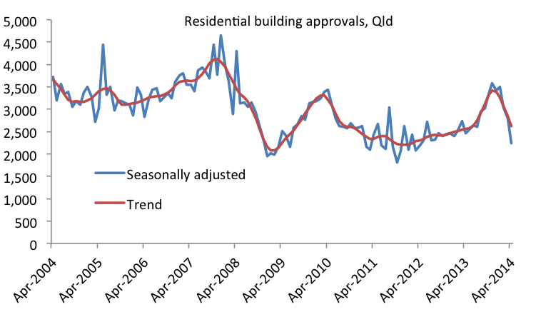 Finally, I look forward to seeing what economic forecasts underpin the Budget handed down this afternoon. I expect Queensland Treasury will have made some conservative economic growth forecasts consistent with those at the Federal level. This would make sense given the relatively low levels of business and consumer confidence in Queensland at the moment. Also, a big correction in the number of monthly residential building approvals, reported yesterday by the ABS, is a little concerning (see chart below).