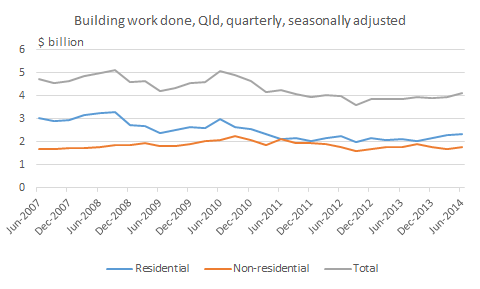 New data from the ABS show that although residential and commercial building activity is picking up nicely, the pick up is in no way large enough to offset the decline in heavy/engineering construction, which has largely occurred in the resources sector (see charts below). The decline in engineering construction will have had both direct and indirect, flow-on impacts, affecting not only people employed in mining construction but engineers, environmental scientists, and others who rely on work associated with mining construction projects. I expect the drop in engineering construction will contribute to weak conditions in the Queensland economy over the remainder of the year at least. As I’ve discussed before, I’m more positive about the medium and long-term outlooks due to the coming commencement of LNG exports and expected demands for workers in health and aged care and other services industries.