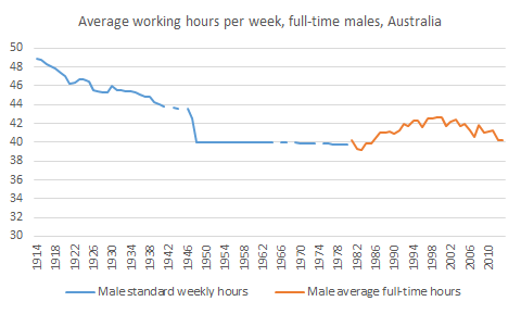 A comment from a reader on my Friday post on robotics and automation got me thinking about long-term trends in average working hours. Historical data on standard male working hours (from Glenn Withers’s chapter in Vamplew’s Australians: Historical Statistics), which I’ve combined with recent ABS data, show a large drop in average hours worked in the last 100 years. While there was a period in the eighties and nineties when average full-time hours started to increase, this appears to have been unwound in the 2000s (see this ABS article on Trends in hours worked, which shows that average working hours across all workers have fallen over the last few decades as the proportion of people working part-time has increased).
