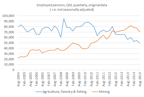 New quarterly employment by industry data confirm falling employment levels in two of the so-called four pillars of the Queensland economy: agriculture and mining (see chart below). Regarding the other two pillars, construction employment appears flat and the ABS does not report tourism employment figures quarterly, because, technically, tourism isn’t an industry, but a category of expenditure.