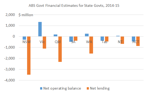 Many years ago, as a result of the economic failures of the Cain Government in the 1980s, Victoria had a poor reputation for economic management, while Queensland had an excellent reputation. A comparison of State Budget estimates for 2014-15 (see chart below), which the ABS published on a consistent National Accounts basis yesterday, shows just how different things are today, with Victoria leading Australia in terms of the net operating balance (i.e. the difference between revenues and recurrent expenses, not including capital expenditures, which push total net lending into deficit).