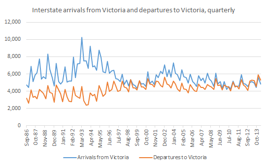 It strikes me that Victoria’s policy settings are superior to other states in many areas, including in environmental management and planning, which has likely improved the livability of Melbourne and Victorian regions relative to the rest of Australia. That may explain, in part, why Victorians are staying put and no longer moving to Queensland (in net terms, as shown in the chart below). Indeed, as I’ve noted previously, Victoria is now actually gaining a small amount of people from Queensland (in net terms).