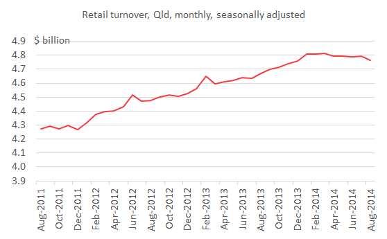 2014 has been a challenging year for Queensland retailers, with retail turnover not growing, and actually declining by around 1% from levels seen earlier in the year (see chart below). I suspect a large part of this is due to the mining downturn and the broader economic weakness that has seen unemployment increase from 6.1% to 6.7% over the year so far. Online purchases from overseas may play a role, although these would affect national turnover, too, and it has at least been growing at a modest rate, according to the ABS data (see Queensland Treasury information brief). Even if they can’t explain the recent poor retail turnover data, online purchases should have a lower threshold for GST, as I’ve posted on before (see Costello right to support drop in $1,000 GST-free threshold for online purchases).