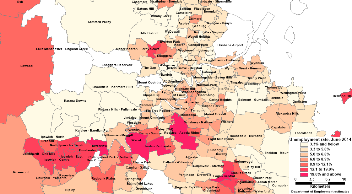 Ipswich and other parts of the Western Corridor are suffering disproportionately from Queensland’s weak labour market, according to the most recent estimates produced by the Department of Employment which combine Centrelink and ABS data (see map below, which can be seen more clearly if you right click on it and open it in another browser window). The Western Corridor includes some small areas with very high unemployment rates. For example, in June 2014, unemployment rates were 26.3% in Wacol, 23% in Riverview and 22.8% in Inala-Richlands. Commonwealth and State Governments should urgently review the factors underlying these high unemployment rates, and consider whether changes to housing, transport or welfare policies might be beneficial.