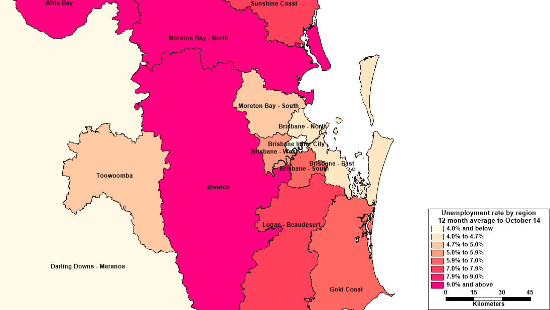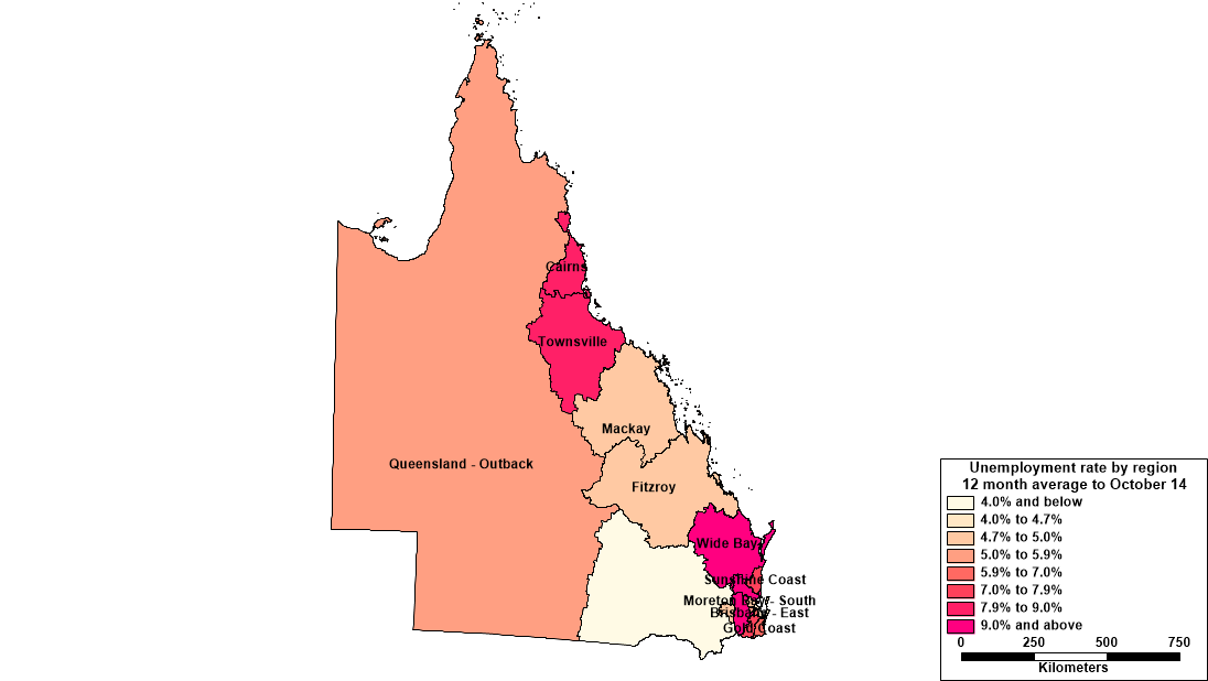 As I’ve commented on before (Good news for regional Qld if Carmichael mine goes ahead – jobs market weaker than in SEQ), over the last twelve months or so, there has been a large difference in employment growth between SEQ and the rest of Queensland. Mark Beath at Loose Change has produced a good chart based on Pete Faulkner’s trend labour force estimates showing this stark difference, which you can view at his post: Cairns employment disappoints in October. Weaker labour market conditions in the rest of Queensland have been reflected in relatively high unemployment rates in several regional areas, including Townsville, Cairns and Wide Bay (see map below based on Queensland Treasury’s 12 month moving average estimates of the original ABS data).