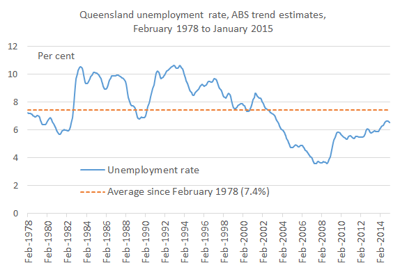 I’ve noticed the Courier-Mail is reporting the incoming Government has “been handed a massive headache with new figures showing unemployment rising and Queenslanders dropping out of the job market.” However, yesterday’s figures simply confirmed the labour market has been lacklustre for some time. There is no reason yet to suspect it will get much worse. As I’ve commented frequently, it is important not to over-react to month-to-month changes in employment and unemployment data, given the sampling errors involved. Finally, from a historical perspective, unemployment really doesn’t look too awful (see chart below). Hence the Government should proceed cautiously in developing new measures to tackle unemployment as they may not be cost-effective, particularly given the RBA’s monetary policy is imparting a significant stimulus to the national economy.