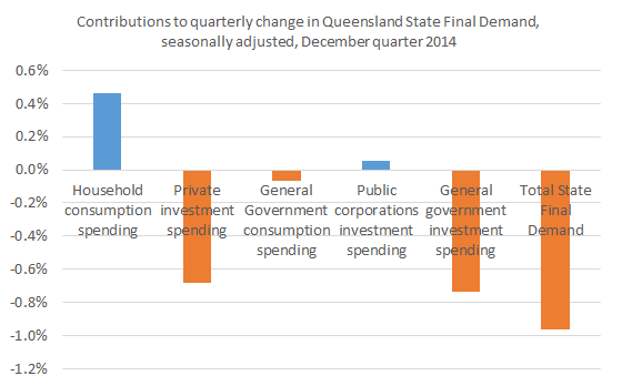 Finally, Queensland Treasury has produced an excellent information brief on the latest State Final Demand data, setting out contributions to the decline in State Final Demand in more detail than I have done. The brief also makes it clear that the actual performance of the Queensland economy over December quarter 2014 may not have been as bad as the State Final Demand numbers suggest, because they don’t account for exports (or imports), and there is data to suggest Queensland’s export performance over 2014 improved markedly. This would be as expected, as past resources sector investments will have translated into increased production and exports. That said, in my view, it seems reasonable to conclude that December quarter was still a poor one for the Queensland economy, particularly when one considers recent increases in unemployment.