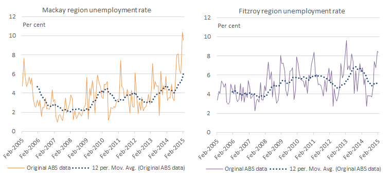 It’s clear the mining downturn is having significant adverse effects, such as large increases in unemployment in regions that are more dependent on mining, such as the Mackay and Fitzroy regions (see chart above, and also see the Courier-Mail report Unemployment doubles in Mackay as mining meltdown hammers town, noting the report uses the volatile original ABS data). Given the profound implications of the mining downturn, it is timely that the Griffith APEC Study Centre has arranged an upcoming interactive panel discussion for Tuesday 5 May in Brisbane: