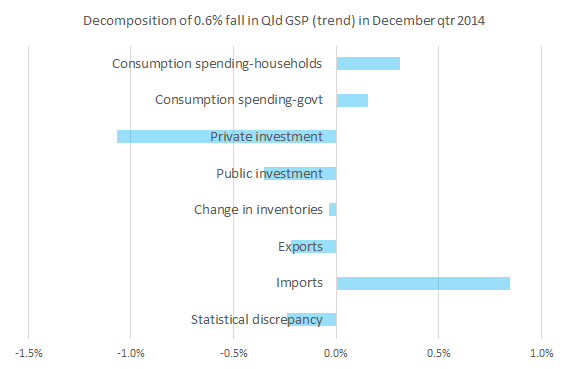 The Queensland Treasury figures showing a recession appear very reasonable to me and are what would have been expected given the drop off in capital investment spending by the resources sector and government from the elevated levels they have been at. The decline in private and public investment is the big driver of the drop in gross state product (GSP) in December quarter (see chart below). But the impact of the drop in investment was not as severe as it might have been, because a lot of capital equipment was obviously being imported, as imports fell in December quarter, offsetting part of the reduction in GSP caused by the fall in investment. (Note that as imports subtract from GSP, a fall in imports adds to GSP.)