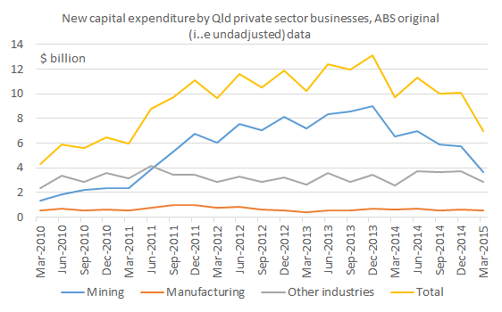 The technical recession Queensland experienced in late 2014 may extend into early 2015 based on new ABS data showing the large drop in mining investment from its extraordinarily high levels has continued into the March quarter of 2015 (see chart above).