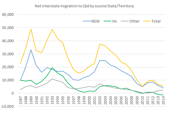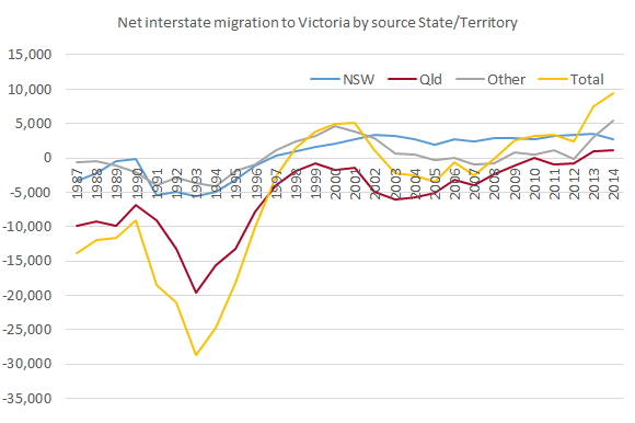 For over two years now, Queensland has been a net loser of people to Victoria, as the historically reliable net migration of people from Victoria to Queensland has reversed (first chart below). The conditions for mass migration out of Victoria into Queensland, such as a big gap between property prices and high unemployment in Victoria, are no longer there, and it appears Victoria’s advantages, such as lifestyle factors and professional jobs, are dominating. Indeed, Victoria is gaining people from all over Australia, and, as the ABS noted in a recent media release, 2014 was a record year for net interstate migration to Victoria (second chart below).