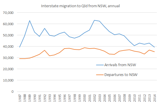 Following the ABC radio and online news coverage I received yesterday on the interstate migration issue, a friend of mine pointed out that redundancies in recent years, notably in the Queensland public service (which I thought were necessary for efficiency reasons, by the way), would have been a significant contributor to out-migration to southern states. Indeed, departures to NSW and Victoria experienced a spike in 2013, in the middle of the previous Queensland Government’s term of office (see charts below). It was the spike in departures to Victoria in 2013 that led Queensland to record a net loss of people to Victoria for the first time.
