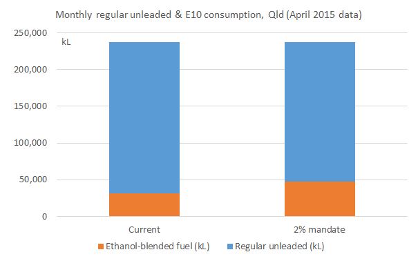 Given the ethanol share is currently 1.3 per cent, the 2 per cent mandate would imply over a 50 per cent increase in ethanol-blended fuel consumption in Queensland or around an additional 16 mega-litres per month, based on April 2015 Australian Petroleum Statistics (see chart below). That is, ethanol-blended fuel would then have to make up 20 per cent of total regular unleaded and ethanol-blended fuel sales.