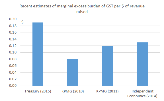 The problem with relying on the recent Treasury study is that, as the Treasury itself acknowledges in the paper, its estimate of the efficiency loss from the GST is much higher than previous findings (e.g. a range of 8 to 13 cents per dollar raised in studies from KPMG and Independent Economics as shown in the chart below). The Treasury cannot explain the reason for this discrepancy, noting rather obscurely (on p. 39 of the Treasury working paper) that “subtle variations in model calibration can affect the relative marginal excess burden of the GST.” My reading of the Treasury working paper is that the Treasury is not particularly confident in its finding. Hence, I would suggest that Andrew Leigh should not be relying on it to make such a bold claim about the GST.