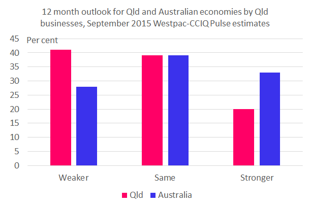 Queensland businesses remain a relatively pessimistic bunch, based on the latest data from the Westpac-CCIQ Pulse Survey, which I have previously argued is the most reliable data on business confidence in Queensland (see my post from June). CCIQ’s media release from last Friday emphasised the boost that the ascension of Malcolm Turnbull appears to have provided to confidence in the national economy, and certainly Queensland businesses are more optimistic about the national economy than the Queensland economy (see chart below showing the percentages of Queensland businesses which expect the State and national economies to be weaker, the same or stronger).