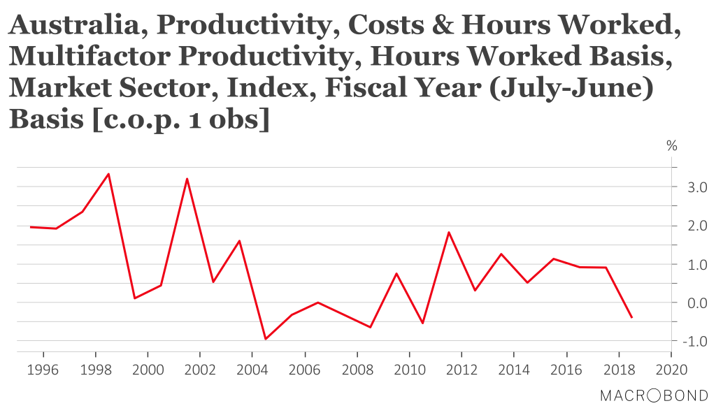 Many economists have seen the desirability of policy changes to improve productivity for some time. Recall that productivity is one of the three Ps, along with workforce participation and population, that determine GDP. Australia had a burst of productivity in the 1990s – due to widespread ICT adoption and to National Competition Policy measures and corporatisation or privatisation of public enterprises – but since then Australia’s productivity performance has been generally considered as disappointing (see chart below).