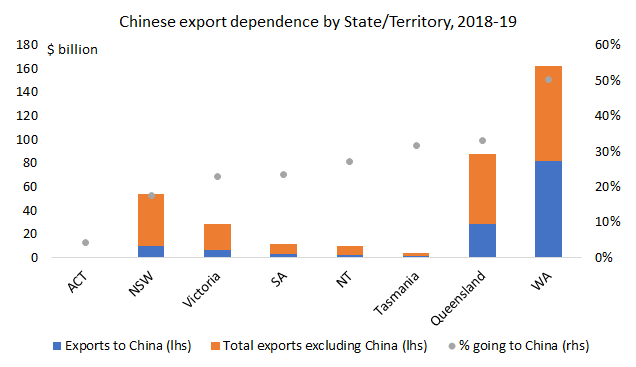 Queensland is obviously heavily exposed to trade restrictions from China (see the chart below and also check out Qld Treasury exports briefing, September 2020). Queensland’s annual goods exports to China of circa $25 billion amount to around 7% of our Gross State Product. Ongoing trade restrictions from China would cause major economic damage, especially in our regional economies such as Central Queensland and Mackay which are highly dependent on resources and agriculture. And, in the lead up to the 2020-21 Queensland Budget which Treasurer Dick will hand down on 1 December, I should note that Chinese trade restrictions would be a big blow to our budget via impacts on royalties and other revenues such as payroll tax and stamp duty which would be lower due to the economic shock. Sure, our exporters may be able to find alternative markets in which to sell, but that will take time, and they may have to heavily discount their products to find non-Chinese buyers.