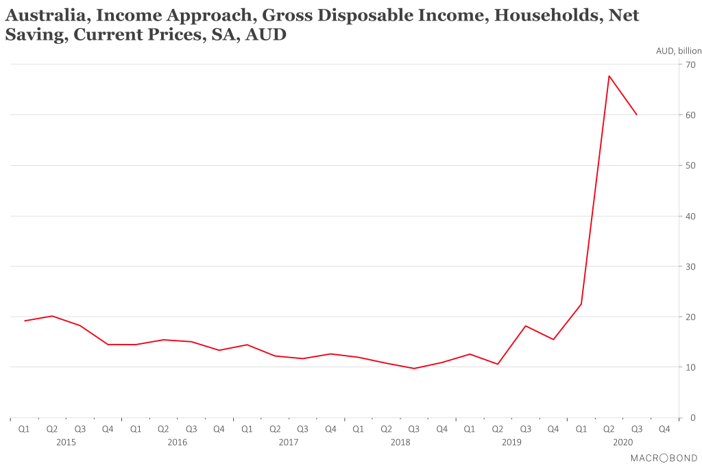 The most likely reason for buoyant confidence is that Australians have been over-compensated by the federal government for the COVID-recession, via JobKeeper and the JobSeeker coronavirus supplement. Future historians and economists will look back and wonder what led a notionally conservative government to bring in such massive support measures. But let’s leave the debate over whether such measures were necessary and desirable to a later time. Let’s just review their impacts by considered data from the September quarter National Accounts released by the ABS last week.