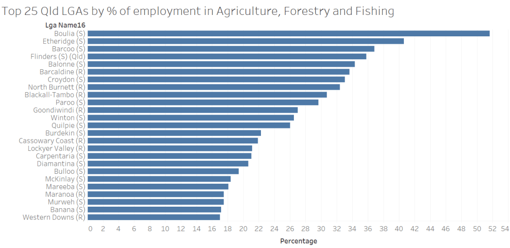 The Local Government Area (LGA) with the highest percentage of employed persons working in agriculture is Boulia, a small community (with fewer than 500 residents) out on the Qld-NT border which specialises in cattle (see chart below).