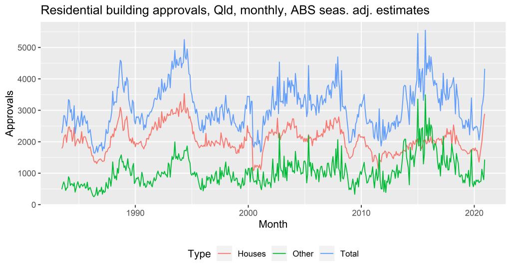 The surge in approvals is good news for the building industry, its supply chain, and the economy more broadly. We’ll need dwelling investment to add substantially to Gross State Product (and GDP nationally) to offset the contractionary impact coming from the winding down of JobSeeker and JobKeeper. We also need to see additional supply to moderate the growth in property prices. According to CoreLogic, Brisbane property prices rose 0.9% in January and 2.5% in the three months to 31 January (see Australian housing values reach a new record high as values continue to rise across every broad region of the country).
