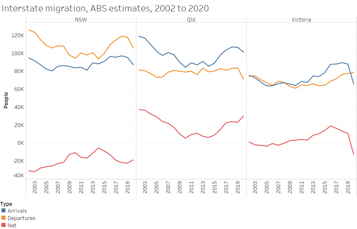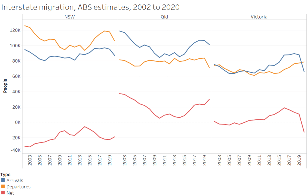 Back in the middle of last decade I often commented on how Queensland was experiencing a brain drain of talented people to Victoria, with vibrant and cosmopolitan Melbourne attracting our best and brightest. That is no longer the case, and for a while now Queensland has been gaining people at Victoria’s expense, a phenomenon that was amplified in 2020. As has been widely reported (e.g. by the Brisbane Times in ‘We haven’t looked back’: Qld’s biggest population boom in 16 years), net interstate migration to Queensland surged in 2020 (up from 22,900 in 2019 to 30,000 in 2020), while Victoria had negative net interstate migration (-12,700 people in 2020 compared with +10,600 in 2019) for the first time since 2008.