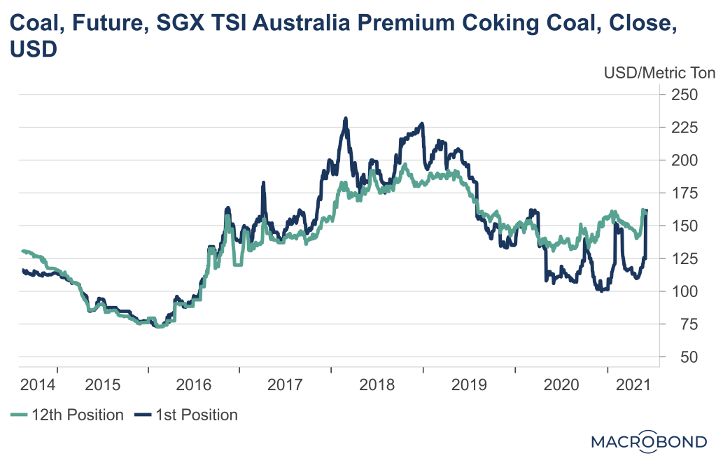 Here’s a chart showing the price surge for thermal coal (see chart below, noting 1st position refers to the futures price for delivery in one month’s time and 12th position the futures price for delivery in 12-months’ time).