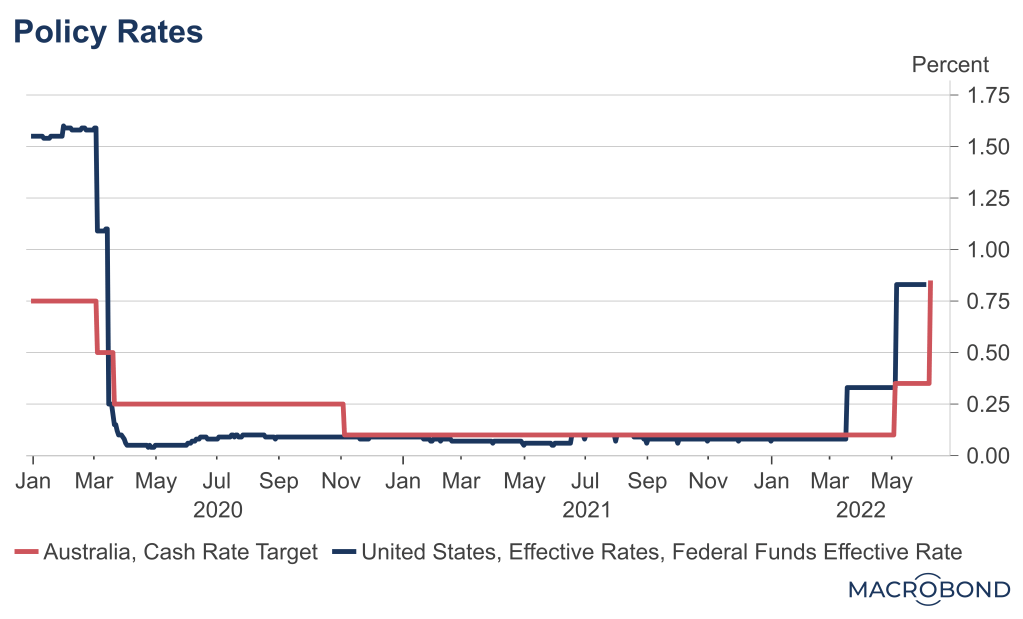 In my previous post, I discussed my latest podcast chat with Morgans Chief Economist Michael Knox who forecast the RBA would today increase the cash rate to 0.85%, as it did. As Michael noted, the RBA has been copying the US Federal Reserve (with a slight lag now) since late 2020. See the chart below comparing the RBA’s overnight cash rate target with the US Effective Federal Funds Rate (currently 0.83%). One reason this is the case is the RBA is wanting to avoid a significant depreciation of the currency which would contribute to inflation through higher prices of imported goods (see my 7 May post Economic update: interest rates, monetary policy, fiscal policy, and coal prices).