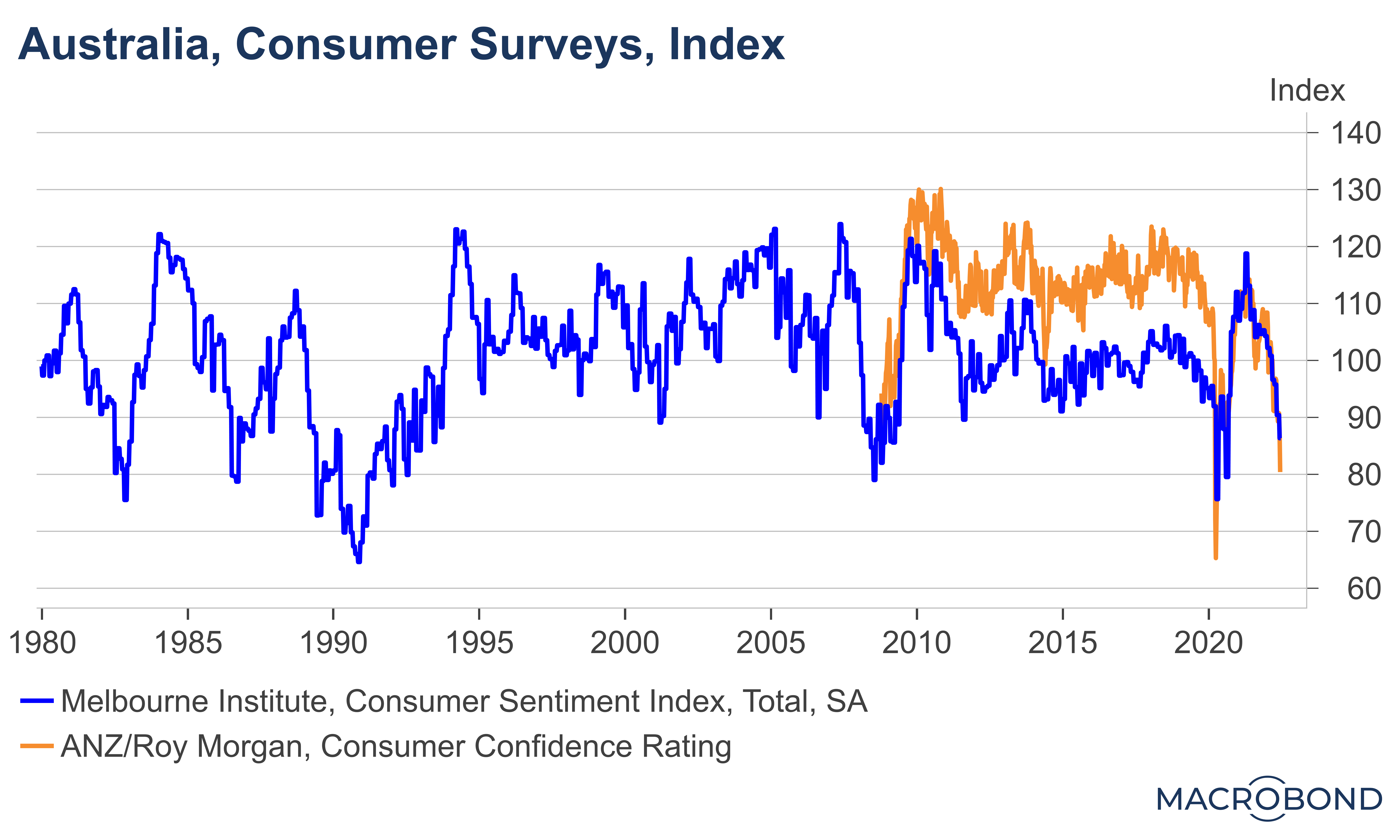 As always it’s important not to read too much into one piece of data, and generally I’ve been optimistic about the Australian economy and even more so about the Queensland economy over 2022-23, but the latest consumer confidence figures are very concerning (see chart above). ANZ’s Richard Yetsenga has pointed out that the ANZ-Roy Morgan consumer confidence measure is now at a level you’d expect to see in a recession, (e.g. the 2020 COVID recession which is the only recession the ANZ-Roy Morgan time series includes), although he’s not actually forecasting a recession at this stage.