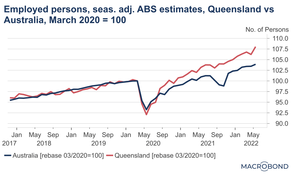 The May Labour Force data released by the ABS yesterday confirmed Queensland has outperformed the rest of Australia over the last couple of years. My view is that this is due to a range of factors including a surge in net interstate migration, a roaring mining sector in this time of high commodity prices, and rebounding tourism spending. Compared with their levels in March 2020, employment is around 8% higher in Queensland than pre-COVID while it’s around 4% higher nationwide (see the chart below).
