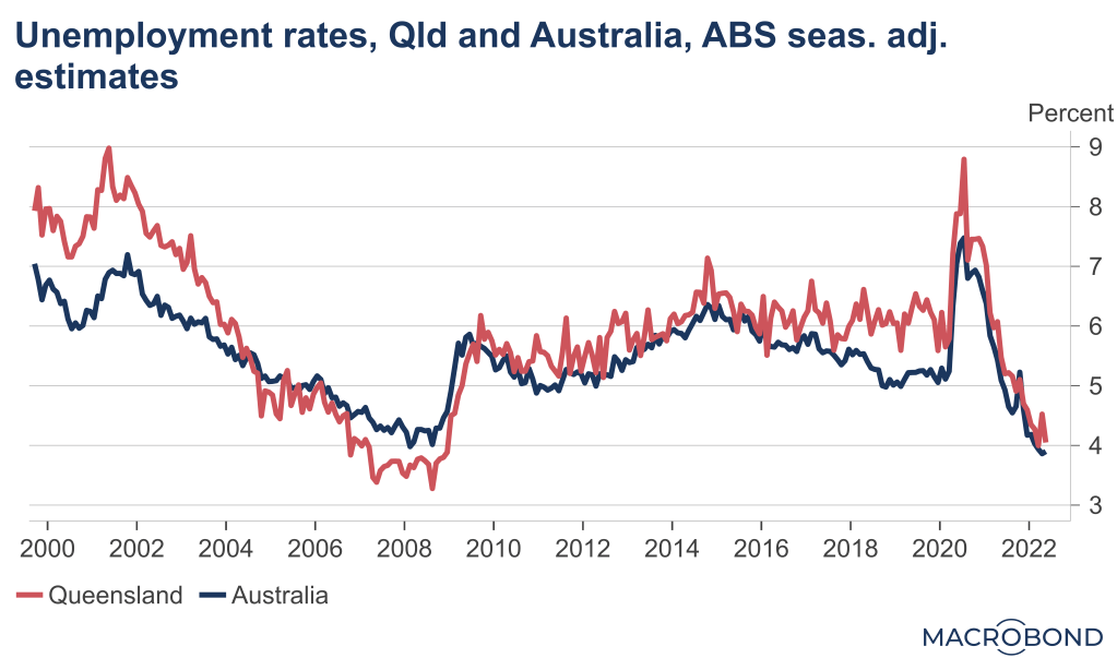 The May data showed a big uptick in employment in Queensland in May but as always I’m cautious about reading too much into month-to-month movements due to the possibility of sampling error or statistical noise so to speak. After the aberrant April numbers, a correction of some kind was likely to occur, so Queensland’s unemployment rate of 4% is now back to being just above the national average of 3.9% (see chart below). Of course, as I explained in yesterday’s post, we now have to wait and see how consumers and the economy overall respond to the interest rate hikes from the RBA. Early signs are not encouraging, alas.