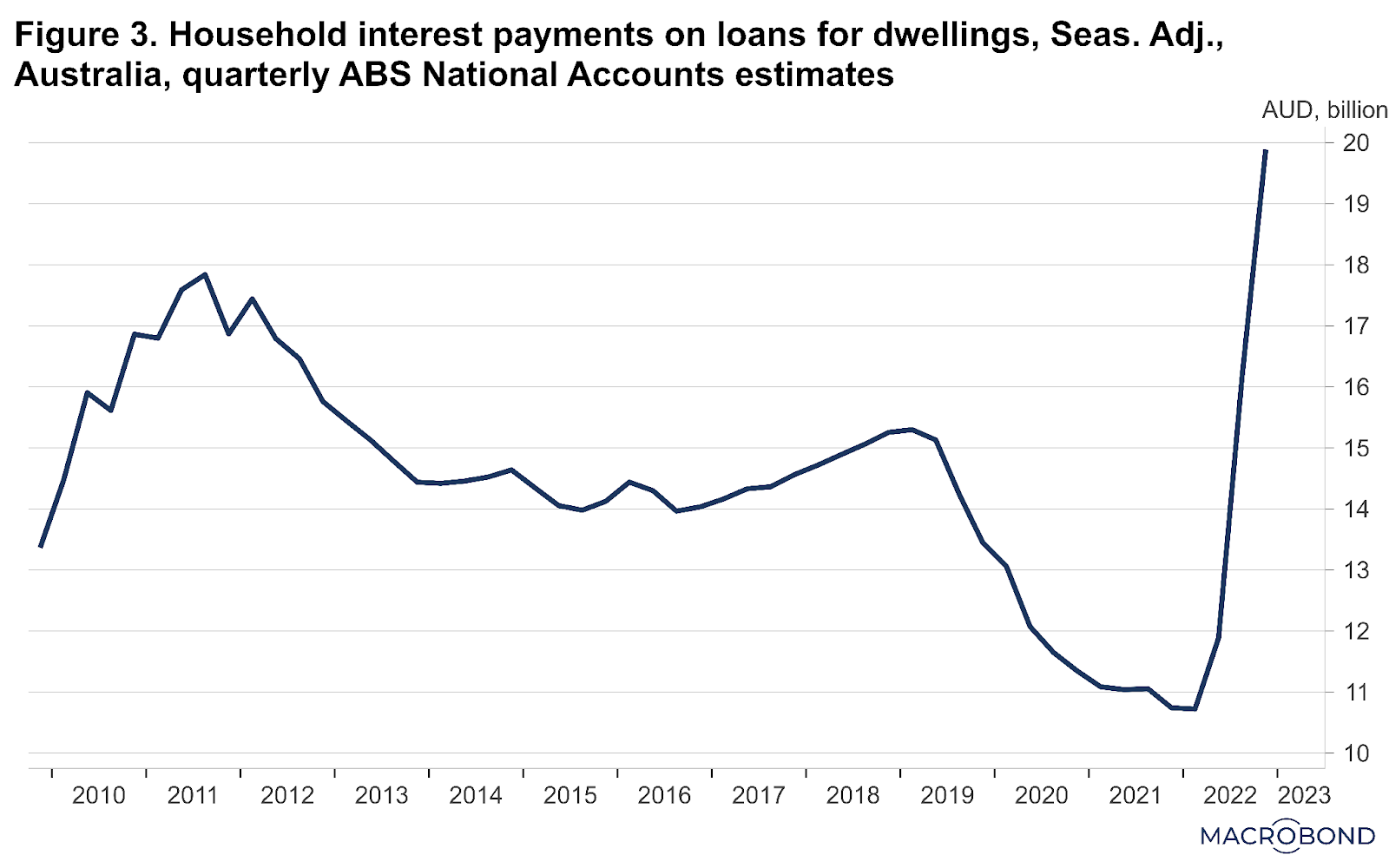 So expect interest rates to continue rising and household consumption spending to slow down even further, possibly to a significantly lower growth rate than the Treasury’s forecast of 1.5% in 2023-24. The interest bill faced by households has been sharply rising, and more increases are to come, particularly as more-and-more fixed rate housing loans move onto variable rates over the rest of 2023 (Figure 3).
