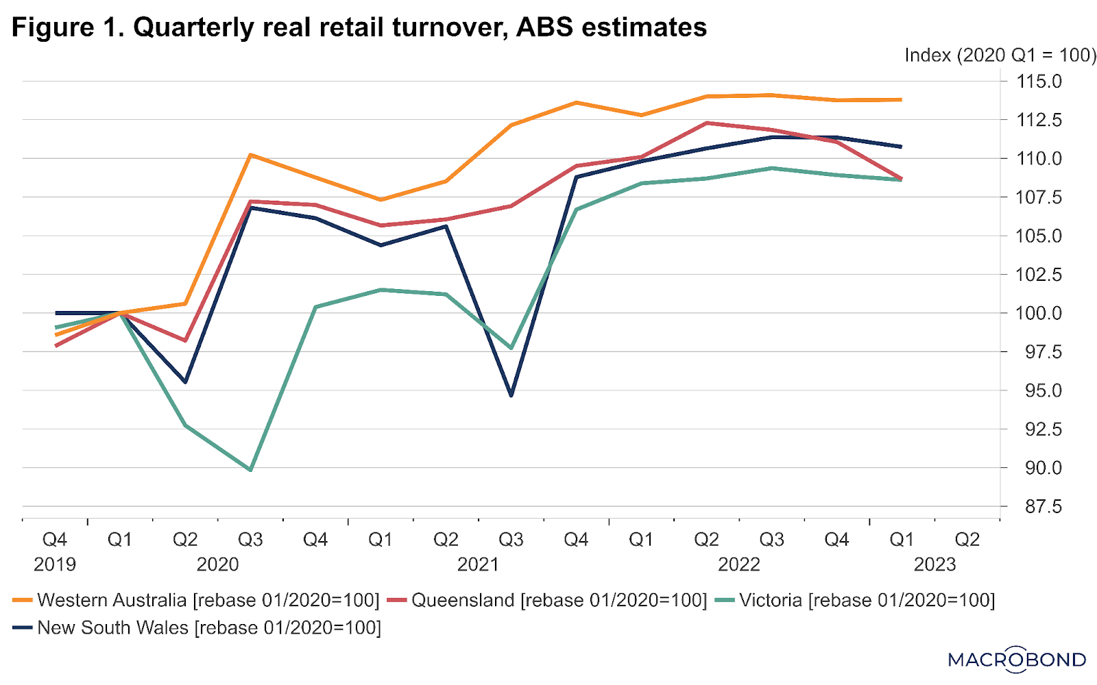 We know retail turnover in real terms is falling as households cut back on purchases of durable goods. This is likely due to a combination of rising prices, interest rate increases, and Australians returning to overseas holidaying. Queensland experienced the largest fall in the March quarter with real retail turnover falling 2.2% compared with a national average decline of 0.6% (Figure 1).