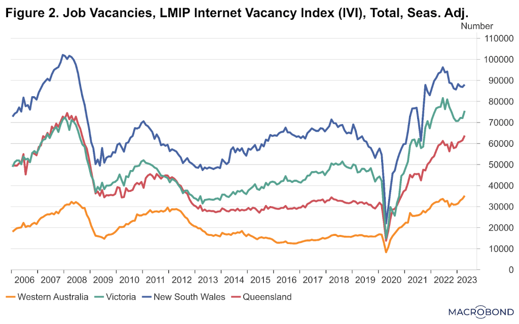One sign of optimism is that the jobs market has been robust so far this year, according to vacancies data which are available up to April. Job vacancies remain at high levels (Figure 2). In Queensland, the number of job vacancies is around twice the average in the years before the pandemic.