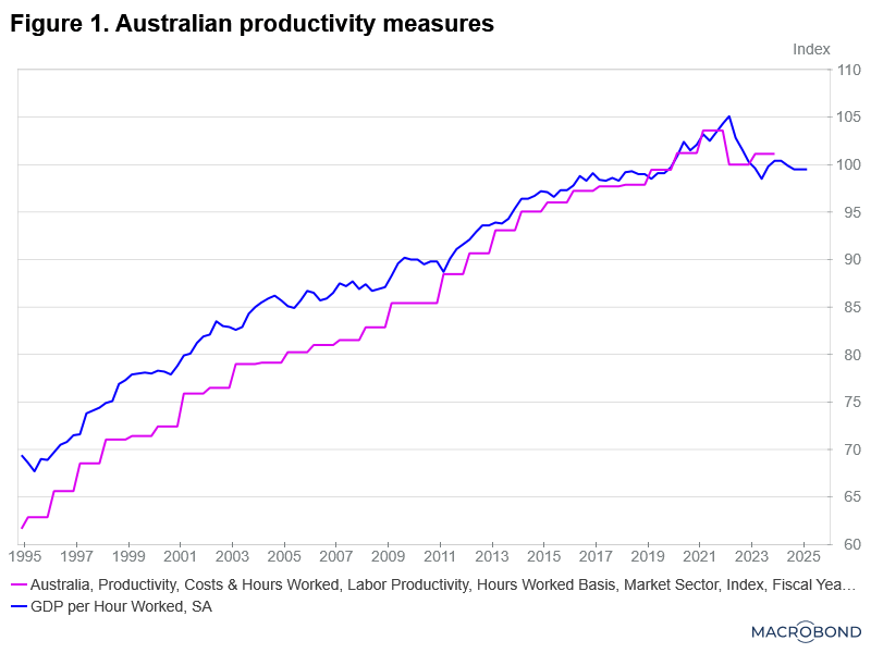 In our latest Australian Taxpayers’ Alliance (ATA) livestream, ATA Chief Economist John Humphreys and I dissect the causes behind Australia’s productivity slump (Figure 1), analysing recent GDP data and the impacts of labour market policies, regulatory constraints, the high cost of energy, and ‘capital shallowing’. A big part of the story is no doubt the rapid expansion of the government and social services sectors, including the NDIS, we’ve seen in recent years, along with an immigration surge that has seen much job creation in low-paying service sector jobs (e.g. Uber Eats delivery drivers).