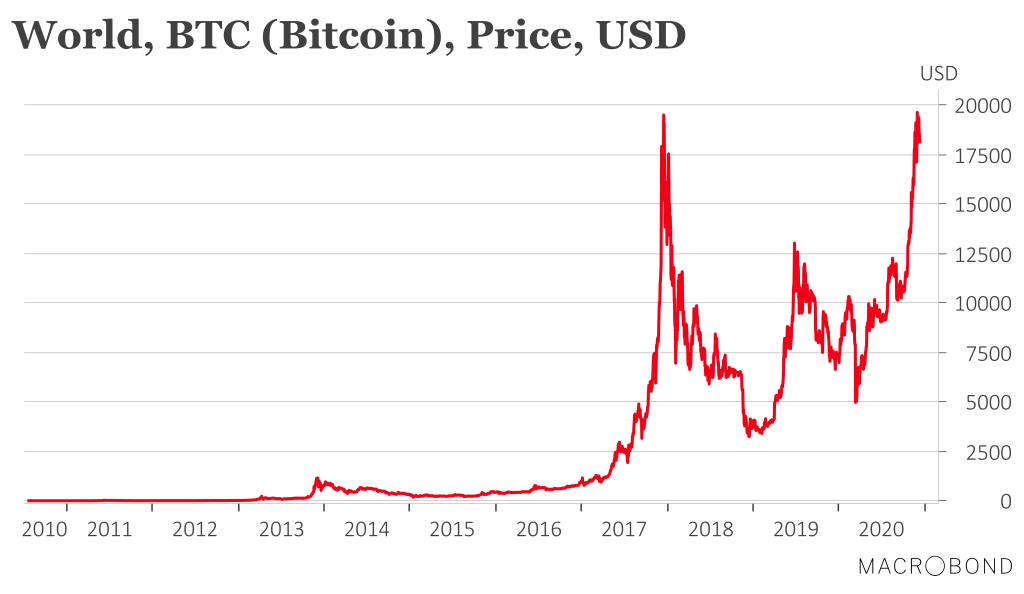 The Bitcoin price was getting close to US$20,000 at the end of last month, but has since come down to a bit over US$18,000. In March, it was around US$5,000 (see chart above). There has been a lot of speculative money going into Bitcoin, driven partly by the Fear of Missing Out (e.g. check out The Wealthy Are Jumping Into Bitcoin as Stigma Around Crypto Fades and Tyler Winklevoss: ‘Smartest people in the room buying the Bitcoin quietly’). Bitcoin is also seen by some as a hedge against future hyper-inflations (as governments resort to Modern Monetary Theory) and political chaos (e.g. check out Naval Ravikant’s latest interview on the Tim Ferriss Show). I have come to think that a fundamental breakdown in civilisation would actually be required for Bitcoin to become useful as money, but then you’d have to wonder what would guarantee the internet would function and Bitcoin would be a reliable means of payment.